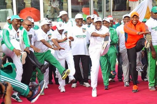 President Jonathan on Saturday morning walked 4.1KM from Aso Rock to Eagles Square accompanied by prominent sports personalities and other supporters. He termed his walk as ‘a physical training exercise’
