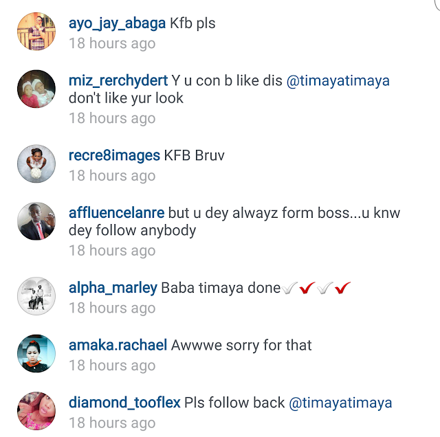 Timaya’s account got hacked so he created a new one and asked his fans to follow him. His fans noticed that he wasn’t following anyone so they asked him to follow them. When he didn’t, they got brutal. Naija has no chill sha. Read the rest of the comments below…